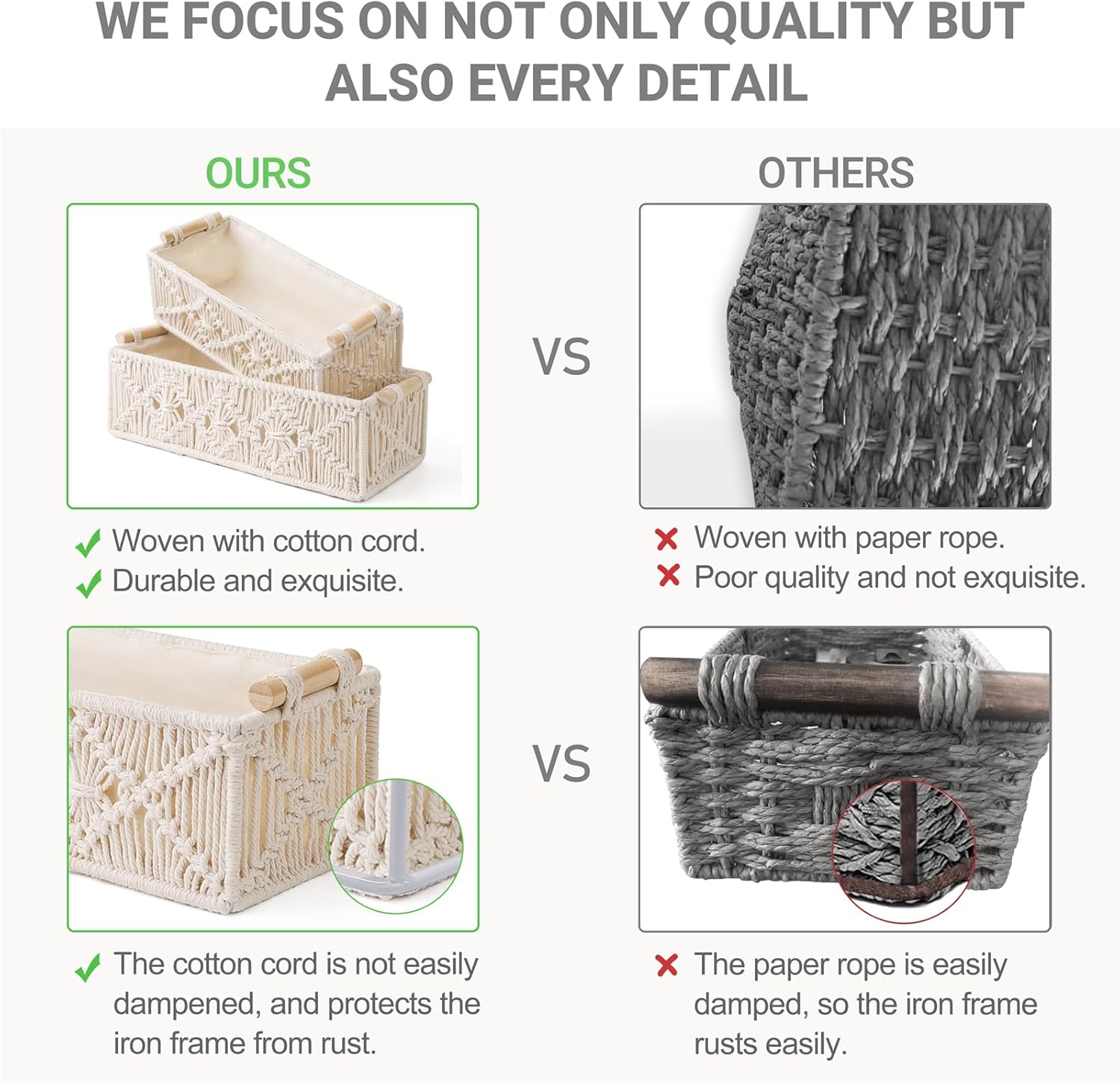 Whether you need to declutter your countertop, tidy up your toilet tank shelf, or organize your bedroom or living room, these versatile baskets are the ideal solution. Crafted with intricate macrame details, they bring a unique bohemian vibe to your decor.